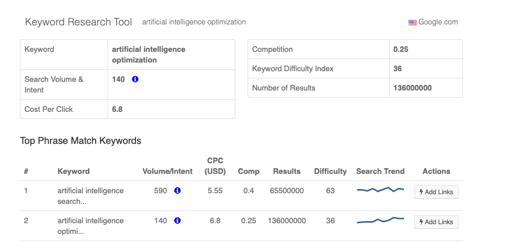 It’ll let us peep crucial metrics like search volume, trend, and keyword difficulty, so let’s pop in one of the keywords ChatGPT just told us about (artificial intelligence optimization).