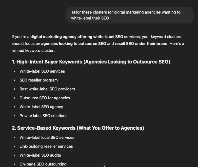 Once again, you can also tweak the suggestions based on your audience. In this next example, we asked it to tailor the list for digital marketing agencies wanting to white-label SEO services: