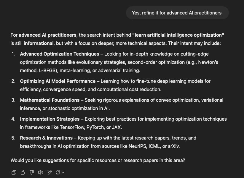 However, we can get more detailed insights by telling ChatGPT to refine its output for a specific target audience. In this case, we chose to tailor the response for advanced AI practitioners.