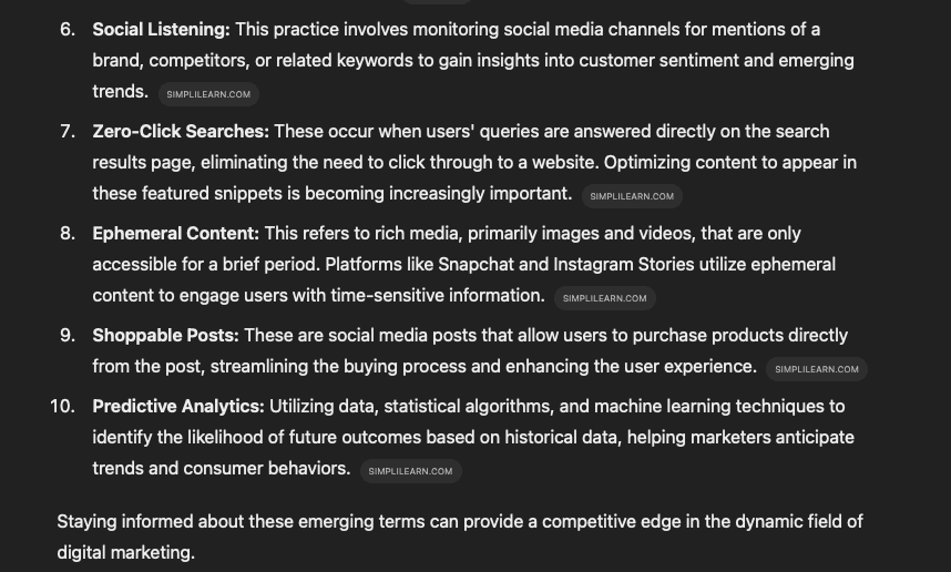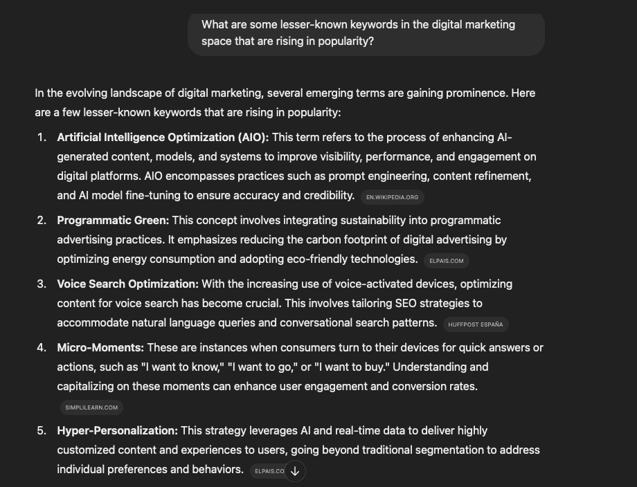 Let’s use a tool like ChatGPT to illustrate what we mean. For this example, we’ll stick with the digital marketing niche. Here’s what happens when we ask ChatGPT to give us some lesser-known digital marketing keywords that are rising in popularity: As you can see, that one simple prompt yielded lots of promising keywords: