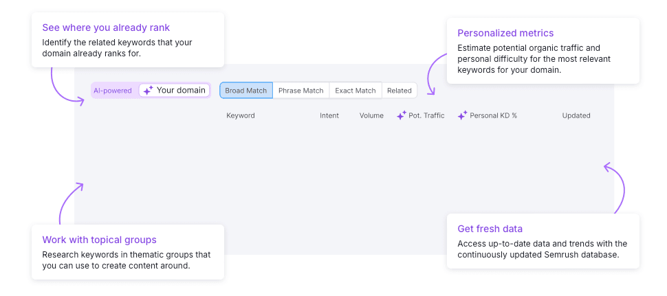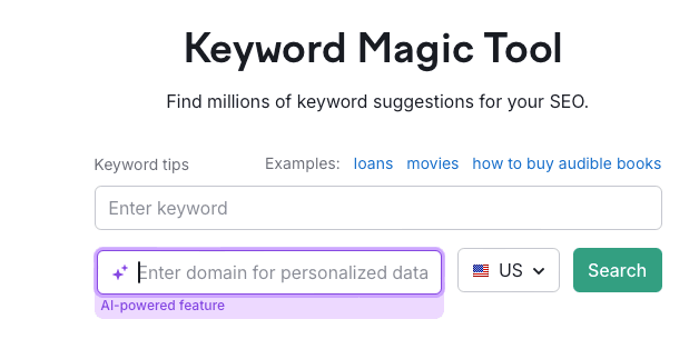 Semrush is a leading SEO platform that’s been adding innovative AI features all the time. One such example is its Keyword Magic tool, which has a new AI-powered twist. Instead of entering generic seed keywords as you would with a traditional research tool, you can add your domain to see personalized insights generated by AI. The tool works by combining Semrush’s existing keyword database (which is massive) with large language models (LLMs). This combination lets the tool determine the relevancy between a domain and specific keywords, enabling the following features: