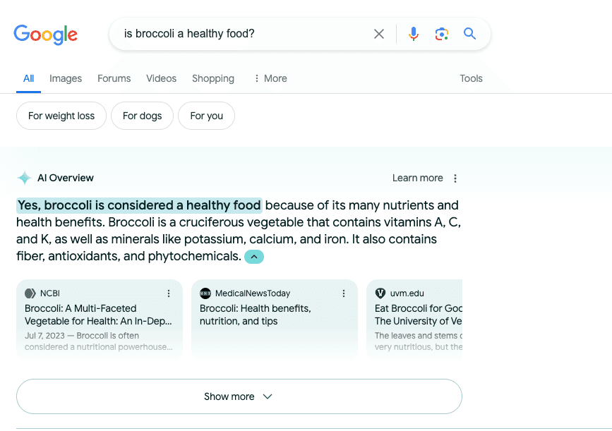 Okay, enough doom and gloom. We’ve been preparing for generative AI features in search engines since SGE’s announcement last year, and we’ve been running experiments ever since. One of our most important findings was that if you’re already ranking in the #1 organic position for your keywords, you’re more likely to get featured in the AI Overview. Why is that? It’s because Google isn’t changing its principles regarding how it views quality, trustworthy content. As long as you create outstanding content for your audience that provides value, Google will want to direct its users to it. The best things that you can do now are:- Optimize for longer queries. Long-tail keywords are the way of the future since users will ask lengthier questions. Researching popular long-tail keywords and commonly asked questions in your niche and creating content around them will help you appear in the AI Overview.