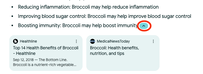 Clicking on them reveals links to more online resources for further reading (these are also the pages the AI summarized to provide the overview).
