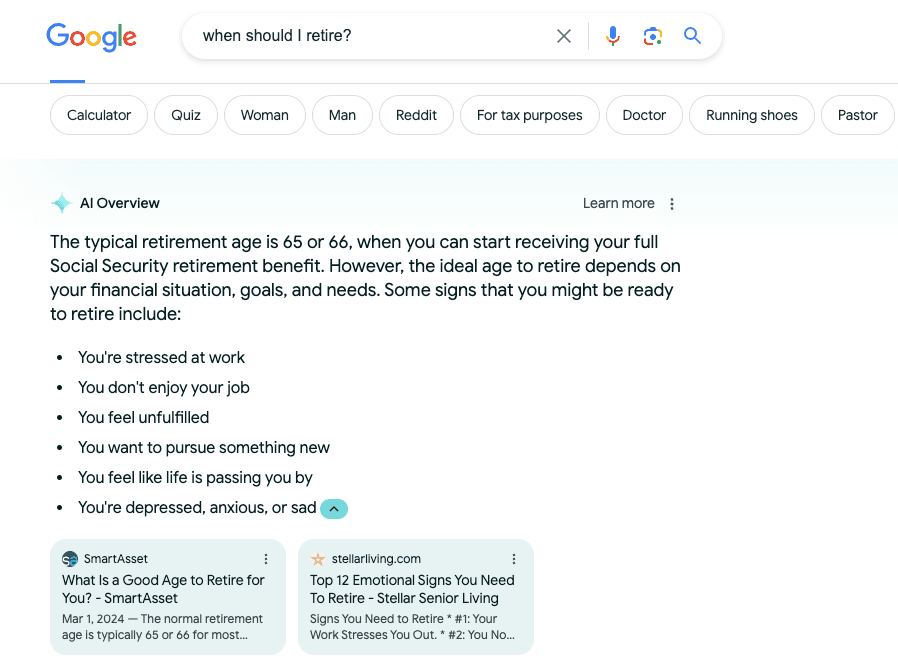 - Your money, your life (YMYL) searches. Google also stated that AI Overviews would not appear for YMYL searches (topics that relate to healthcare and finances) due to the possible legal implications if the information provided is inaccurate. However, this seems to be something they’re still working on, as AI Overviews are appearing for some YMYL queries (see below).