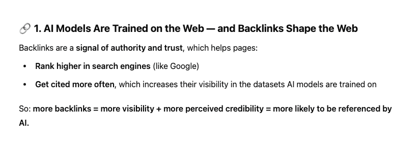 - For more specific queries requiring the most up-to-date information, generative AI programs tap into the Internet to fetch real-time data. When doing so, they look for top-ranking articles and popular content coming from trusted domains. How did these domains establish trust in the first place? You guessed it, by building authoritative backlinks.