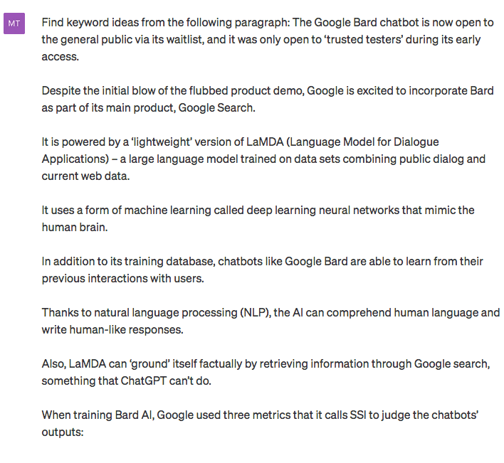 Do you have a competitor that consistently outranks you in the SERPs? If so, then one of the best things you can do is analyze the keywords they’re targeting, as well as how they use them throughout their content. Yet, it can be a bit tricky pinpointing the exact keywords a competitor uses in a piece of content, but ChatGPT makes it easier than ever. As an example, we entered a few paragraphs from our blog post on Bard AI and asked the chatbot what the primary keywords were: