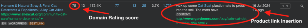 As you can see, the link insertion is for their Cat Scat plastic mats, and it comes from a website with a very high DR of 75.