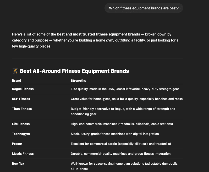 ChatGPT says it’s listing “some of the best and most trusted fitness brands online.”