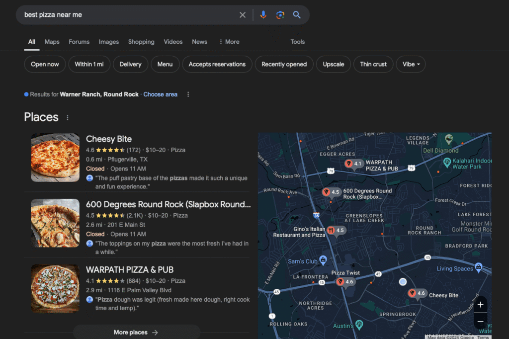 As you can see, the local pack highlights three local pizza restaurants and includes information like their address, hours of operation, and average rating out of five stars.