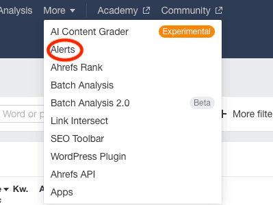 You can also set up Ahrefs Alerts to receive email notifications whenever you gain a backlink or lose one. The Alerts page is located under the More drop-down menu on the top navigation bar: