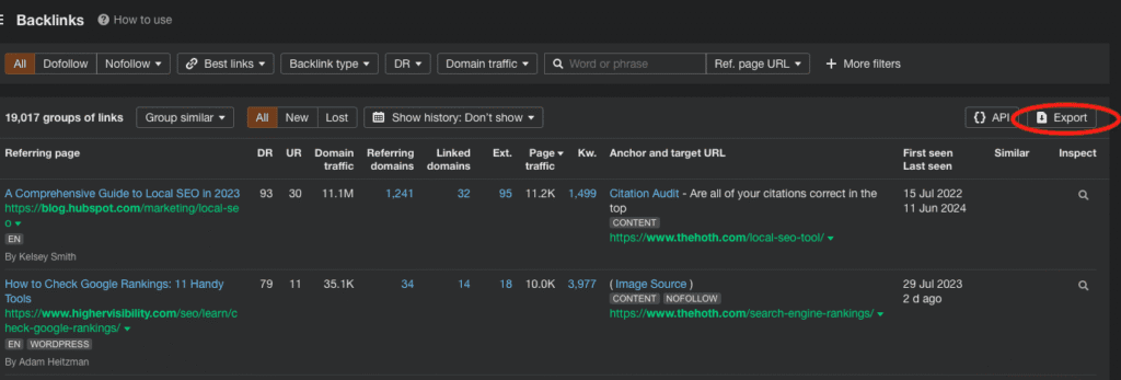 Exporting your backlink data in Ahrefs