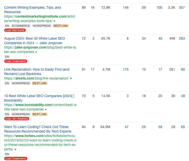 This provides a list of all the broken backlinks appearing on a domain, saving you the trouble of having to use a crawler like Screaming Frog (although that method works, too).