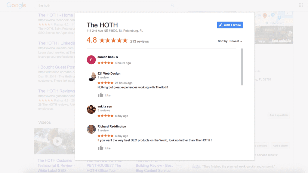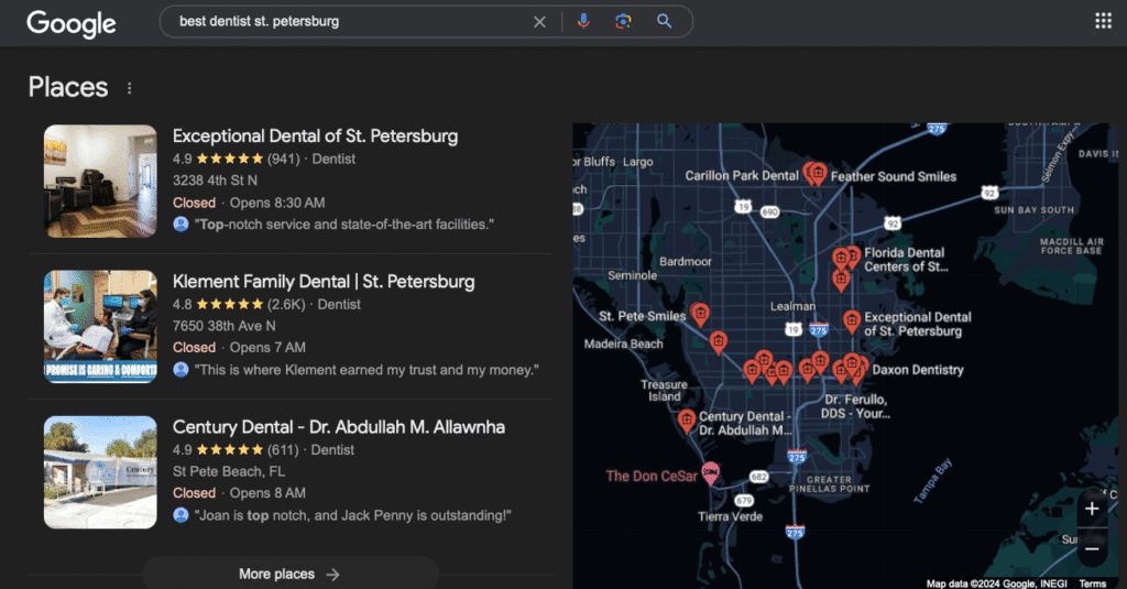 Whenever you search for a local business, you don’t want to settle for just any old company, do you? Of course not, which is probably why you begin every local search with the word ‘best,’ which is an extremely common search habit. For example, if you want to search for a dentist in St. Petersburg, Florida, you’d likely search for ‘best dentist st. petersburg.’ Well, whenever Google’s algorithm sees ‘best’ in a local keyword, it will only display Google Business Profile listings that have a rating of 4.0 or above. So, if you want to capitalize on ‘best (your product or service)’ searches (and you DO, believe us), you need lots of Google reviews. If your GBP listing has mostly positive reviews, you’ll show up in ‘best’ searches on the Google Map pack (also called local pack). We’ve covered this in previous chapters of the guide, but as a reminder, the local pack is a powerful search feature that looks like this: