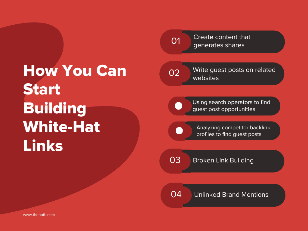 In addition to being practically update-proof, white-hat links also provide the following benefits: ✨Cost-effective. Black-hat link tactics tend to involve shelling out cash for links, which is expensive and wasteful if the links don’t pan out. Since there’s no paying for links in white-hat link-building, it’s the more affordable option. ✨Improve your reputation. White-hat tactics like guest posting and being a resource for reporters involve creating valuable content that’ll help establish your brand as a thought leader. Conversely, black-hat tactics will actively harm your reputation if you get caught, which can spell disaster for your future outreach efforts. ✨Build relationships. Writing guest posts, targeting link insertions, and engaging in broken link building are all ways to form long-lasting relationships with other website owners – which will lead to acquiring more high-authority links in the future. Also, as you continue to grow and expand your network, it’ll become increasingly easier to generate the backlinks you need. White-hat links provide many benefits and involve virtually zero risks for digital marketers.