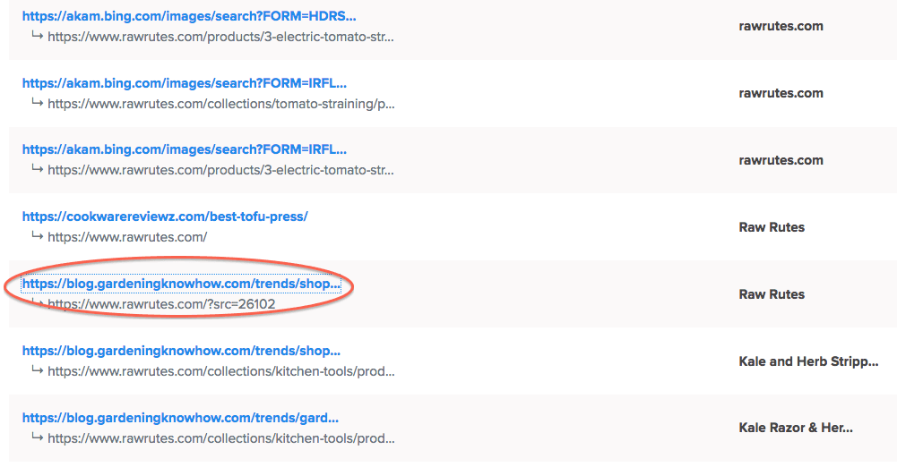 If you’re burned out on using search operators, you can also analyze competitor backlink profiles to discover where they’re writing guest posts. Take to Google and type in your most important keywords, then run the top #5 results through our free Backlink Checker tool. From there, dig through their link profiles to find guest blogs, and then add those websites to your list of guest post opportunities. Sticking with the gardening example from before, let’s give this a whirl. If you sold gardening tools, one of your top competitors would be Raw Rutes, so let’s peep at their backlinks. After doing some digging, there’s a backlink from a site called Gardening Know How where Raw Rutes has been writing some guest blogs.
