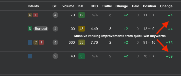 As you can see, some of these keywords rose in rank by up to 70 positions!