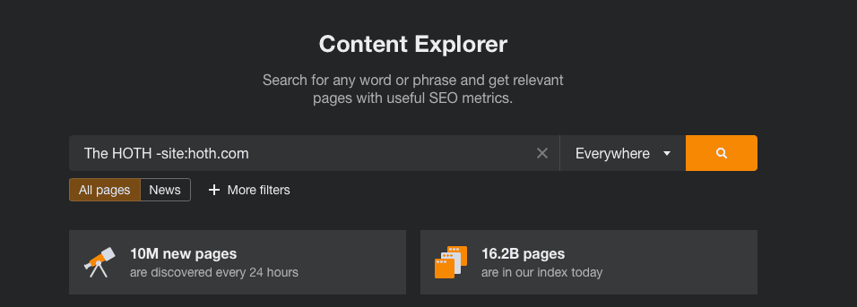 There are times when writers mention a brand online but don’t include a link back to their website. These are called unlinked brand mentions, and with some detective work and outreach, you can turn them into backlinks. Here’s how to find them using Ahrefs. Using the Content Explorer tool, enter your brand name plus the formula ‘-site:yoursite.com’ to ensure your web pages don’t appear in the results: After you hit the Search button, there’s still one step left. You need to enter your website’s URL into the Highlight Unlinked filter so that the results will display websites that mentioned your brand but didn’t link back to your site.