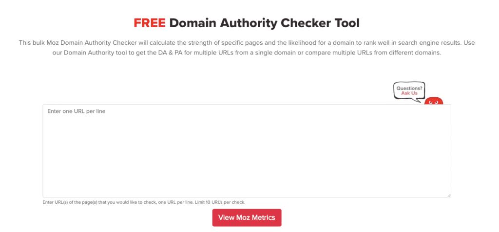 Simply enter your target URLs into the tool (one URL per line) and hit View Moz Metrics to see each website’s domain authority score.