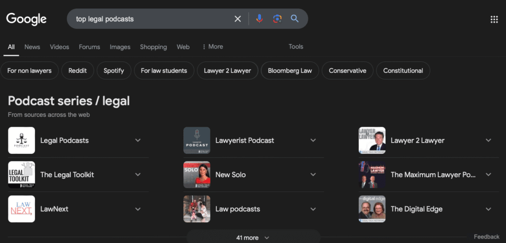 Including visual content increases your sharing potential by 40%, so you should include high-resolution images, videos, and infographics in your posts. Also, legal podcasts are a goldmine for generating backlinks and referral traffic. There are hundreds of legal podcasts online, and appearing on them is a great way to boost your SEO. They’re also pretty easy to find, so you should be able to do some standard Google searches to find them. Here’s what happens when we search for ‘top legal podcasts’ on Google: