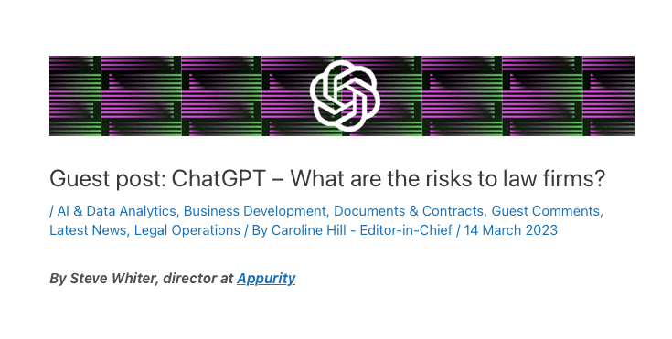 Here, the author is writing about the risks of inappropriate usage of ChatGPT at law firms for Legal Insider, a website specializing in legal tech news.