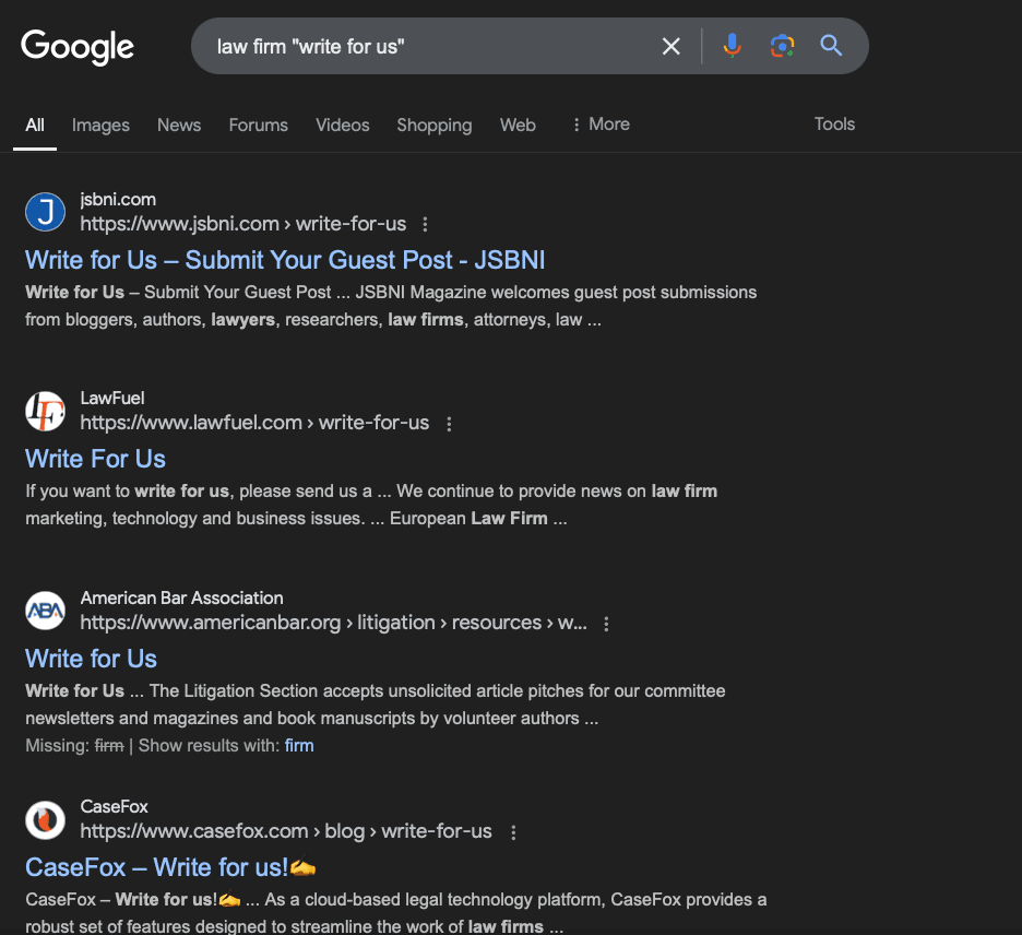 Google’s search operators are your best friend when looking for legal guest posting opportunities. By wrapping a phrase in quotes after a keyword, Google will only display websites that carry that text. An example would be searching for something like law firm “accepting guest posts” or law firm “write for us,” but there are lots of variations you can use. Here’s what happens when we search for law firm “write for us”: