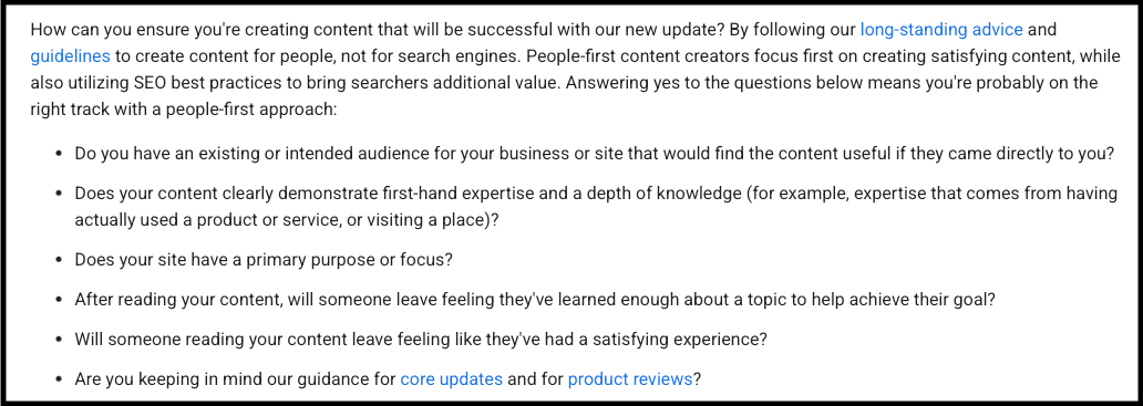 Google’s Helpful Content Update first emerged in 2022, but it was later integrated into its core ranking system in March 2024 (while making the whole thing more sophisticated). It was the birth of the double-E acronym, as Google began to value first-hand experiences in content. This came about because Google noticed many reviewers were writing reviews for products that they had never even touched. Because of this, Google wanted to see proof of experience. This applies not only to reviews, but also to content in general. Here’s what Google’s official blog says about producing ‘people-first content’: