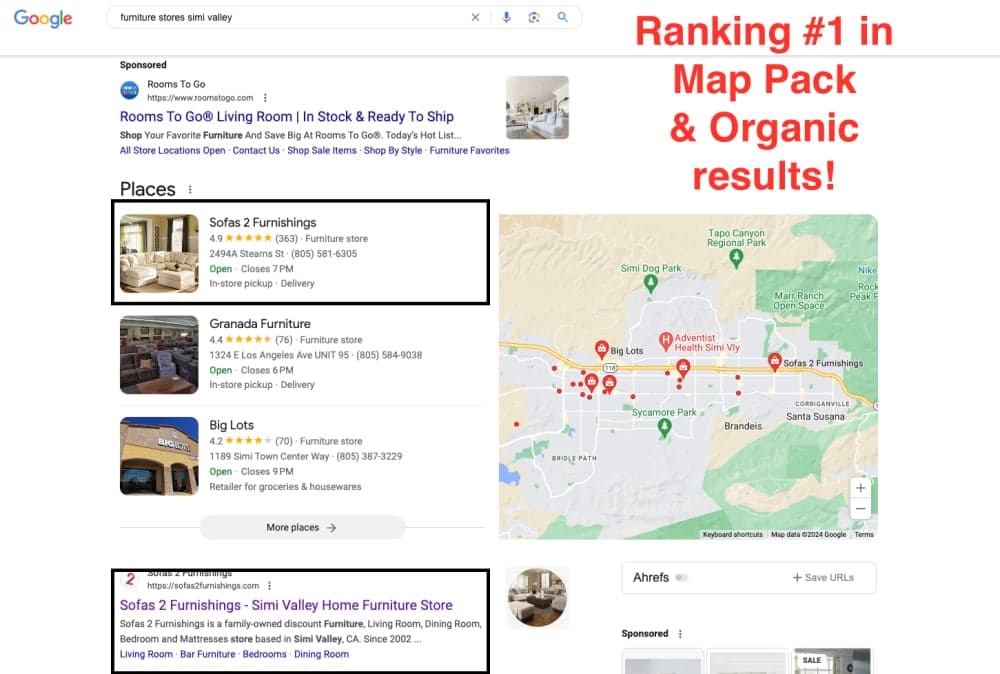 Don’t just take our word for it, let’s look at some real-world proof that SEO provides a low CPL yet high-quality leads. Sofas 2 Furnishings is a family-owned furniture store in Simi Valley, California. They operate in a highly competitive space, as there are many competing furniture stores in the area. When they first came to us, they weren’t generating much traffic and mainly relied on paid ads, so their CPL was up there. After 9 months of managed SEO, we got them ranking for thousands of new keywords, many of which were in the top 3. Most impressive, we got them appearing at the top of the local pack and in the #1 organic result for the keyword ‘simi valley sofas’ (a huge money keyword for their industry):