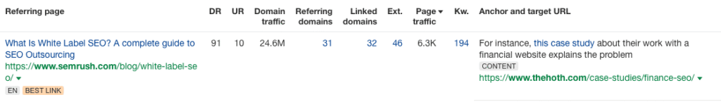 Natural backlinks won’t just improve your search rankings; they’ll also get the word out about your brand. How so? It’s due to the nature (pun intended) of natural backlinks. Since other respected websites are linking to your content, it exposes your brand to their audience, who may be totally different from yours. This is great because you may find new audiences who enjoy your content and want to consume your products and services, and you may not have found them otherwise. As a real-world example, here’s an instance where SaaS SEO juggernaut Semrush gave us a shout-out for the renowned quality of our white-label services: