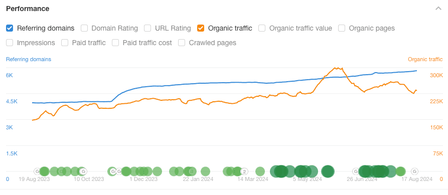 Natural link-building is a necessity because it provides much-needed sustainability to link-building campaigns. By creating high-quality content that attracts shares due to its usefulness and entertainment value – you’ll keep the links coming in. Without creating outstanding content, you’ll have to rely on coercive, manipulative tactics to keep generating backlinks, which can land you in trouble with Google. For example, some site owners try to skirt content creation responsibilities by setting up private blog networks (PBNs). What’s that? A PBN is a network of dummy websites that only exist to link back to a central website. The websites on the network are just thin facades meant to give the appearance of a functioning website, but there’s no depth to them at all. Clicking around on a PBN site will soon shatter the illusion since they won’t have any new content or external links (and the content they do have is either extremely thin or plagiarized). Google has become extremely adept at identifying PBNs, so you’re much better off directing that time and energy toward creating helpful content. Take it from us; we’re a living testament to the power of natural link-building. Here’s a look at our referring domains and organic traffic: