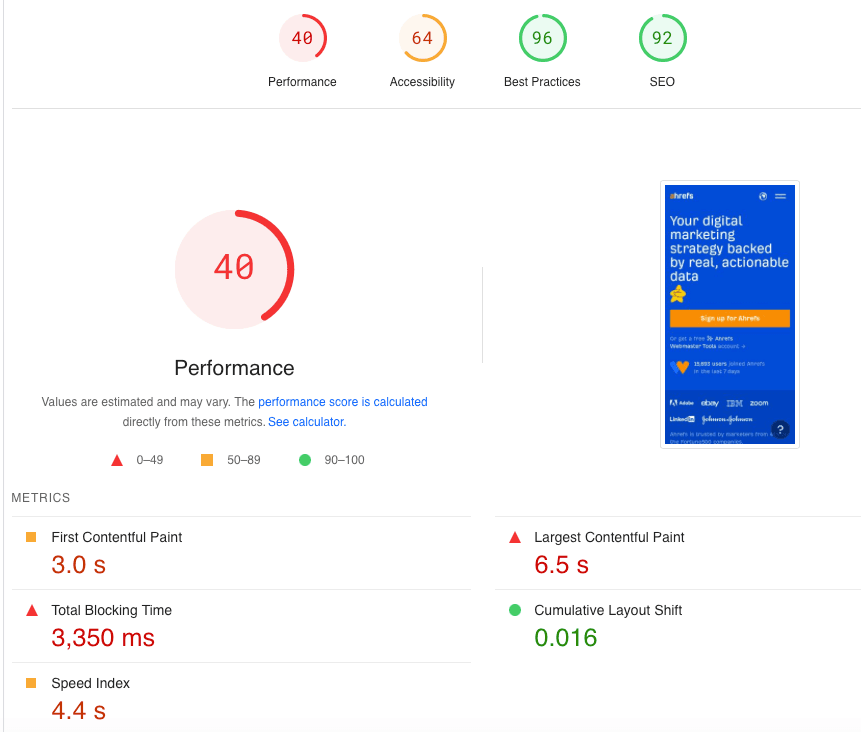 Now that you know that you need to keep an eye on your page speed, how do you do that? Are you supposed to sit with a stopwatch and click on one of your web pages? No! The good news is there are plenty of tools out there that will let you check your page speed, including a free tool from Google itself. You can also use tools like Semrush and Ahrefs to check your speed metrics, but they require paid subscriptions. Here’s a look at the top ways you can start testing your page speed (and site speed) today.Google PageSpeed Insights