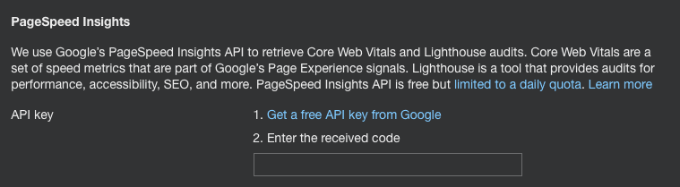If you’ve got a subscription to Ahrefs, you’ll be able to check your site speed using its Site Audit tool. You can even enable official Google Core Web Vitals metrics to show up in the tool, which you need to do in the Crawl settings. First, you’ll have to get an API code from Google (the link is in Ahrefs) that will enable Core Web Vitals (and Lighthouse) data to appear in Ahrefs.