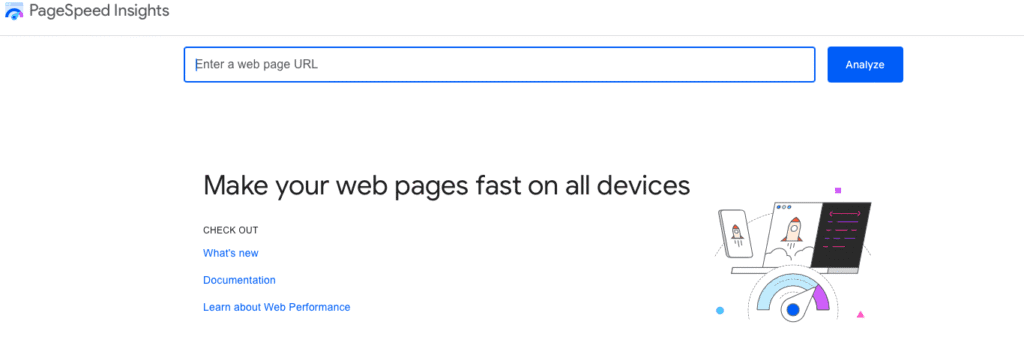 Google provides a free tool that any site owner can use to test their site speed via PageSpeed Insights (which is powered by Google Lighthouse). The best part is that the tool uses Google’s real Core Web Vitals metrics, so you get to see how your website performs on the test. How does the tool work? It’s extremely simple. All you have to do is visit the PageSpeed Insights web page and enter the URL for the web page you want to check: