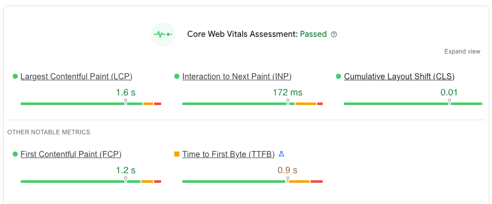 As you can see, these are all the speed metrics that we mentioned earlier. To pass the Core Web Vitals test, your site must score in the green range for each metric. If your scores are yellow or red, it’s a sign that your page speed needs work.