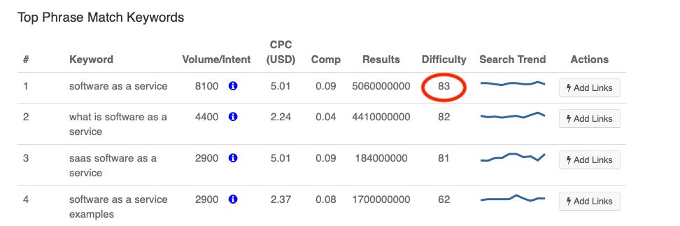That means it’ll be extremely hard to rank new SaaS content if you target popular industry keywords. To do so, you’d have to outrank existing content in the top 3 organically ranked positions, and those sites tend to have immaculate SEO and ridiculously high domain authority scores.