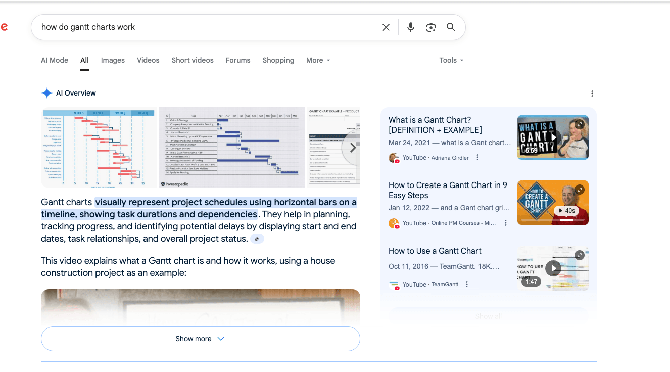 Google’s AI Overviews and Featured Snippets provide quick answers to (mostly) informational queries, which can cause users to find what they need on the results page. Because of this, they never click on any of the organic results, thus the name zero-click search. As an example, let’s say you wanted to learn what a Gantt chart is, so you search on Google for ‘how do gantt charts work?’ Before AI Overviews, this type of informational keyword was perfect for generating traffic to your website. For instance, a project management website could whip up a piece of content that defines Gantt charts. Assuming their SEO is solid, prospects from their target audience would see their article whenever they searched for information about Gantt charts. This was a fantastic way to generate leads at the top of your sales funnel. Well, here’s what the results page for that keyword looks like now: