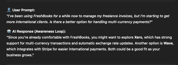 Next, let’s look at the AI-powered SEO funnel, which is the way of the future. It takes into consideration the impact of zero-click searches, nonlinear funnel progression, and ‘invisible influence’ (i.e., the chunk of the buyer’s journey that occurs off your website). If the traditional funnel was a straight line, the AI funnel is a circle or a loop. This is because AI search assistants always push users into what’s next, and they remember their past buying experiences. As a result, a user may go from the awareness phase straight to the purchase phase, and then back to the awareness phase for a new product. Here’s an example from ChatGPT: Here, the prospect was in the consideration phase for the FreshBooks product.
