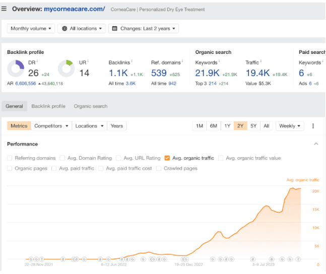 Before we wrap up, let’s look at a real-life scenario where investing in strategic SEO paid off big time for one of our clients. This case study tells the story of Cornea Care, a new and virtually unknown eyecare site that was seeing 0 organic visitors. Fast forward after investing in our managed SEO services (HOTH X) for approximately 6 months, and they’re regularly generating 20,000 organic visitors per month. Just take a look at these improvements: