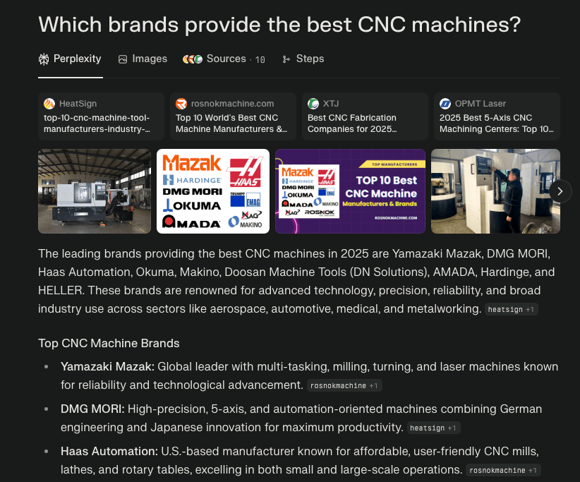 Here’s an example of what we mean. Let’s ask Perplexity which brands provide the best CNC machines. From a marketing perspective, we’re a highly qualified prospect for CNC machine providers. Here’s the response: As you can see, Perplexity provides direct brand recommendations. If you were an interested buyer, you would likely directly visit each brand’s website.