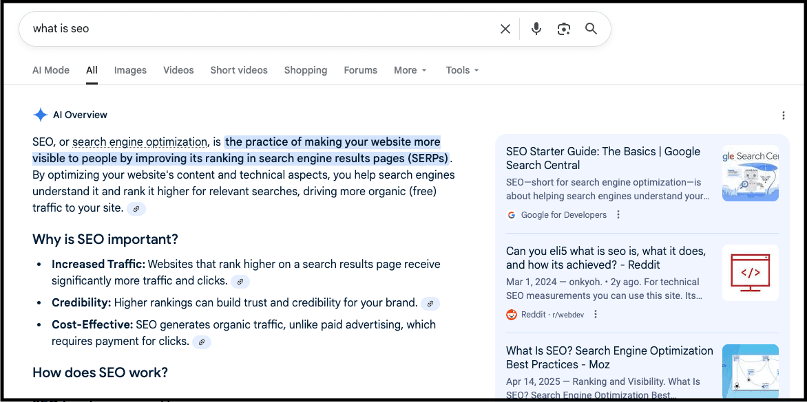 Many websites have seen sharp declines in organic traffic lately, which has caused some marketers to declare that SEO is no longer effective. In late 2024, a study by Rand Fishkin discovered that 60% of searches were zero-click searches, meaning users didn’t click on any organic results. Why is that? The main reason is the prevalence of Featured Snippets and AI Overviews. As an example, imagine that you wanted to learn the definition of SEO after hearing a coworker mention it in passing. You don’t have a website or need SEO services, you’re just really curious about what the term means. To find out more, you type ‘what is SEO’ into Google. Here’s what you’ll see: Right there at the top of the results page, you see the definition, including what the acronym means. That’s literally all you wanted to know, so you close the tab.
