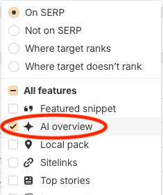 Doing so brings up a list of search results features that you can target, including AI Overviews: