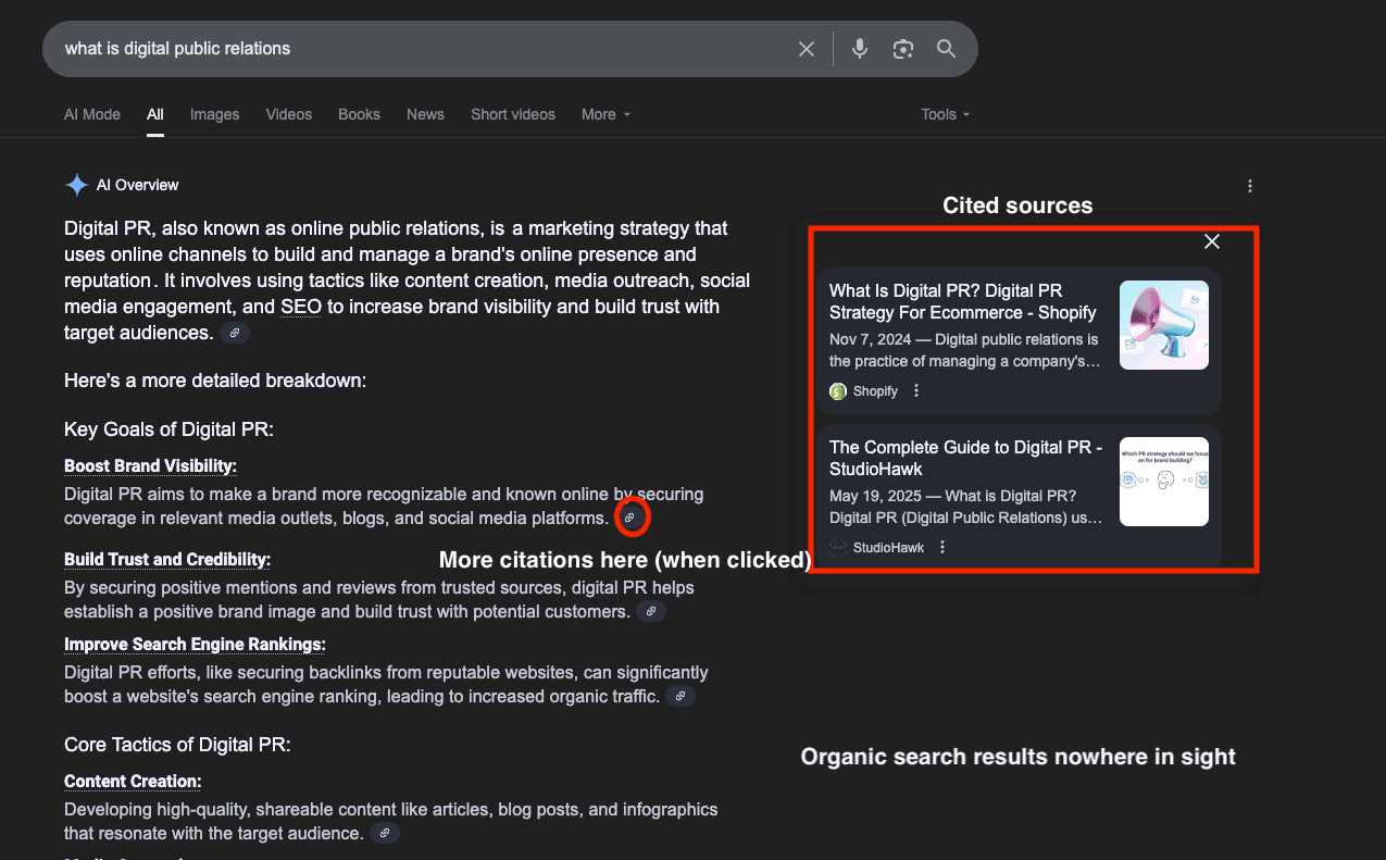Instead, there’s a source panel containing links to the web pages the AI used to generate its summary.