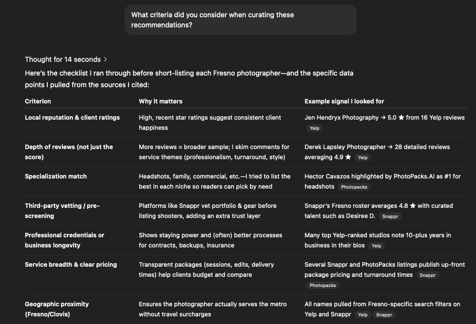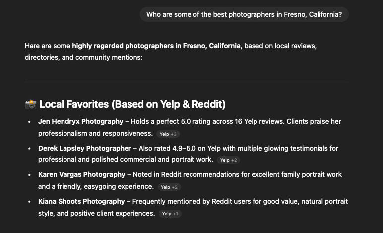 Here, ChatGPT provides us with what it believes to be the highest quality photographers in the area we requested.
