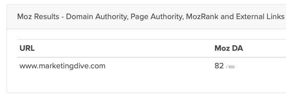 We like to check a domain’s DA score in addition to its Domain Rating because Moz looks at factors other than a website’s backlinks.