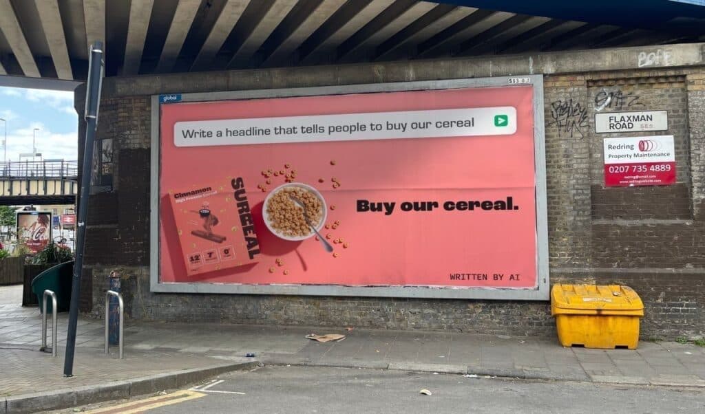 Like the previously mentioned example from Oreo, newsjacking involves ‘inserting’ your brand into a trending news story. It could be as simple as sharing your expert opinion on a developing story, or as complex as creating a piece of art to capitalize on a recent trend. Cereal brand Surreal chose the latter route, as they created entire billboards as part of their newsjacking stunt. Since AI-powered tools like ChatGPT are all the rage, Surreal decided to use an AI copywriting tool to write some unintentionally hilarious headlines for their cereal. They posted the results on billboards and shared them on social media: