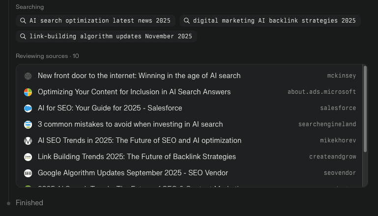 As you can see, it ran three individual searches that focus on every information request from the original prompt.