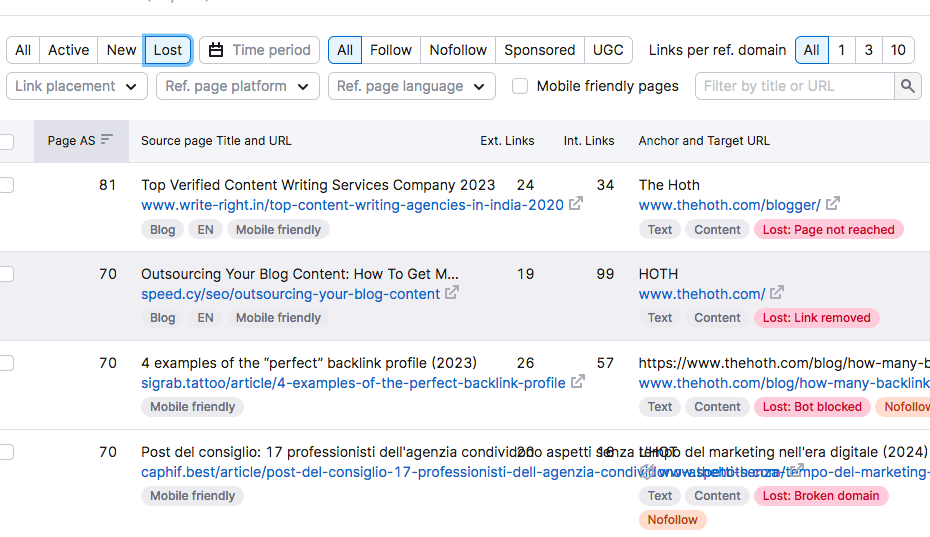 Not all backlinks last forever, which is an unfortunate fact of life. However, Semrush keeps track of all the links you lost via the Lost backlinks filter on the Analytics Report. There are a number of reasons why you may lose a backlink. It could be that the site owner moved the page containing the link but forgot to add a redirect, resulting in a 404 Not Found. Or it might be that a competitor convinced them to use one of their links instead. Whatever the case may be, you can use the Lost Backlinks filter to quickly identify your lost backlinks. Not only that, but the report will even tell you what the issue is, such as a broken domain, page redirect, or if the site owner removed the link manually.