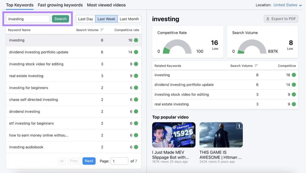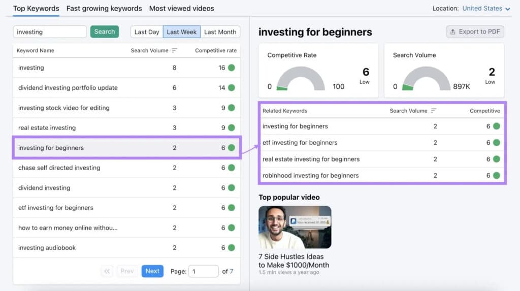In the example provided, you could base a video around the keyword ‘Investing for Beginners’ since it has a few weekly searches and a low competitive rate.