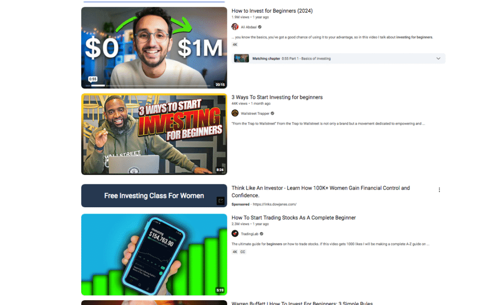 | Pro tip: To get a better idea of a keyword’s search intent (and the most popular video type for it), enter the keyword you choose into the Top Videos feature to view the top videos currently ranking for it. For instance, the videos currently ranking for ‘Investing for Beginners’ follow the how-to format, so you could either follow suit or do something different to stand out. |