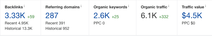 As you can see in the image below, the site’s backlinks, organic keywords, organic traffic, and traffic value are consistently improving as well.