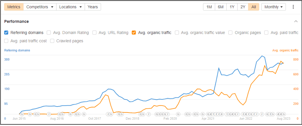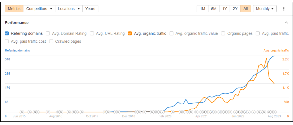 Before we began handling their SEO, they were receiving next to no organic visitors or backlinks. That all changed as soon as we began creating content and building links for their domain.